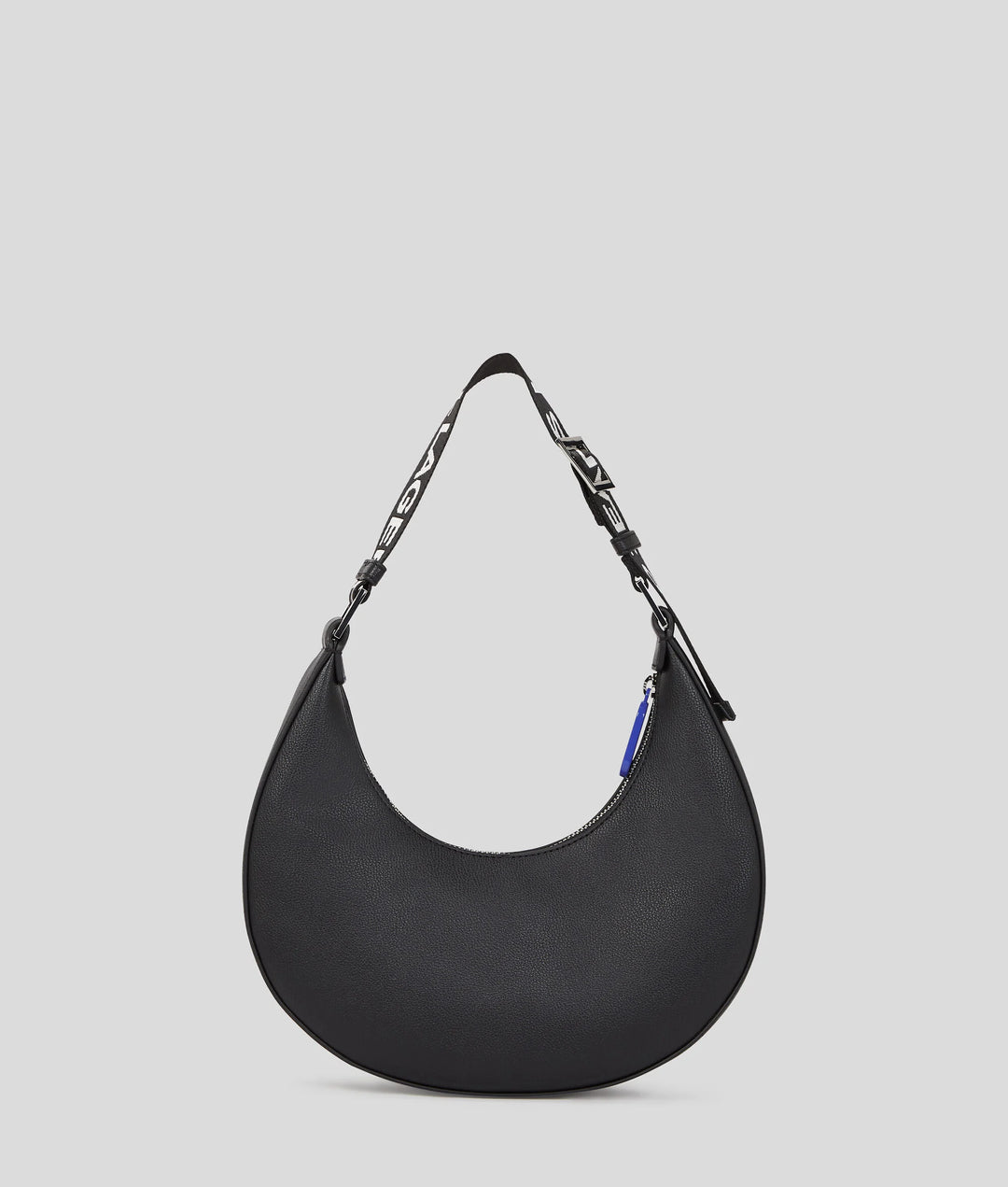 The half-moon shoulder bag showcases a sleek silhouette that comfortably Practical accessorizing with impact. Made to sit snug under the arm, this half-moon shoulder bag features a KARL LAGERFELD JEANS-branded webbing strap and metal box logo for playful attitude.