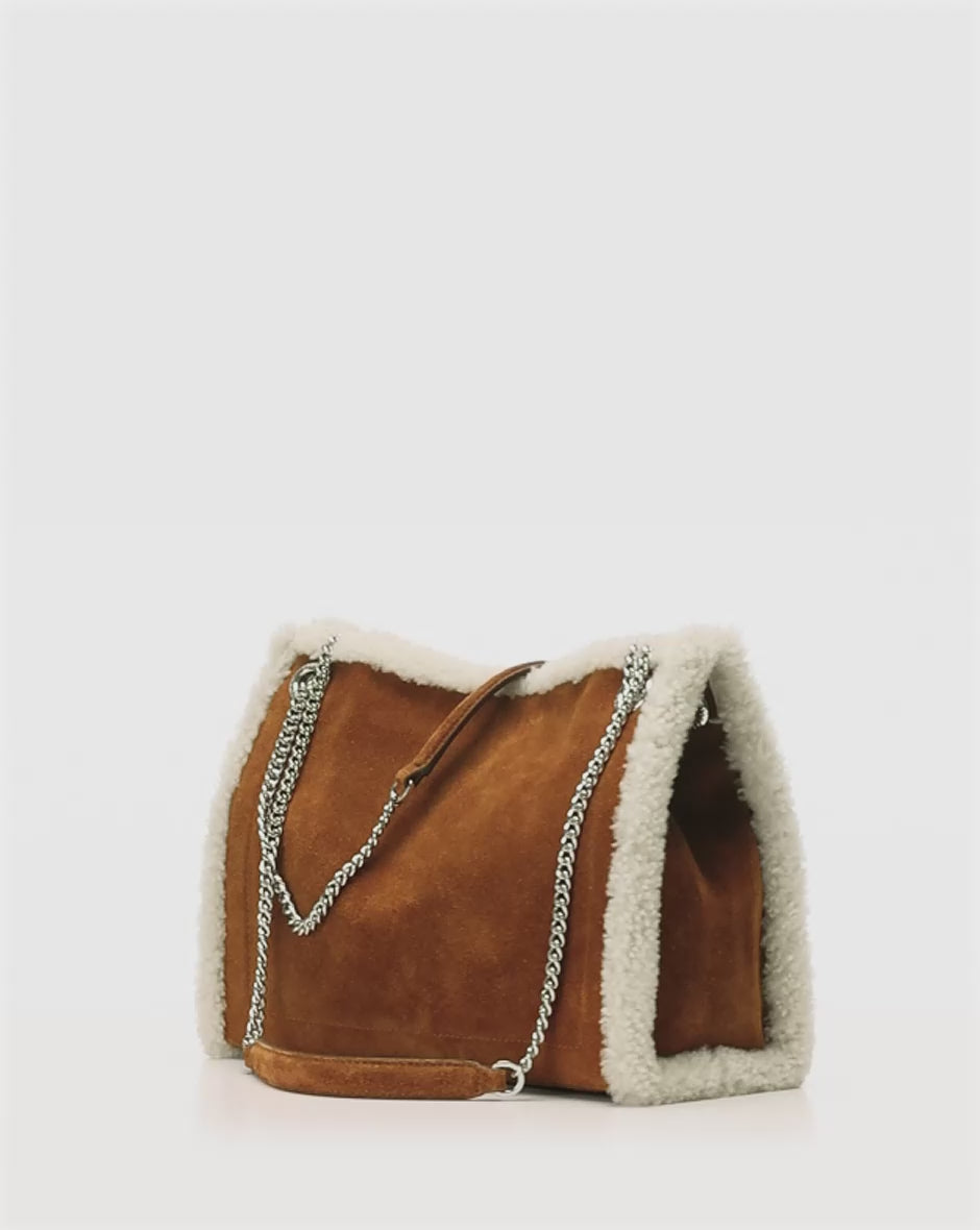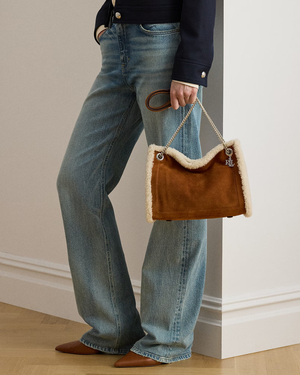 A practical and luxurious addition to the Bradley collection, this medium shopper tote boasts a slouchy, capacious silhouette constructed with velvety suede and plush shearling trim. Convertible chain top handles allow you to style this piece as a crossbody or shoulder bag, while an "LRL" charm adds a signature finish.
