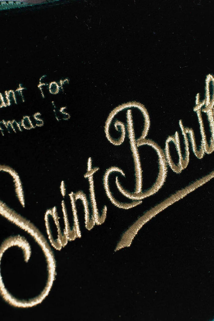 MC2 Saint Barth clutch bag in dark green velvet, embellished with gold embroidery reading "All I want for Christmas is Saint Barth." An elegant and fun accessory, perfect for adding a touch of glamour to the holiday season. Featuring a top zip closure and a matching fabric zipper pull, it's ideal as a beauty case, organizer, or mini clutch for any special occasion. This accessory combines practicality and Christmassy spirit, making it the perfect gift or chic addition to your holiday look.