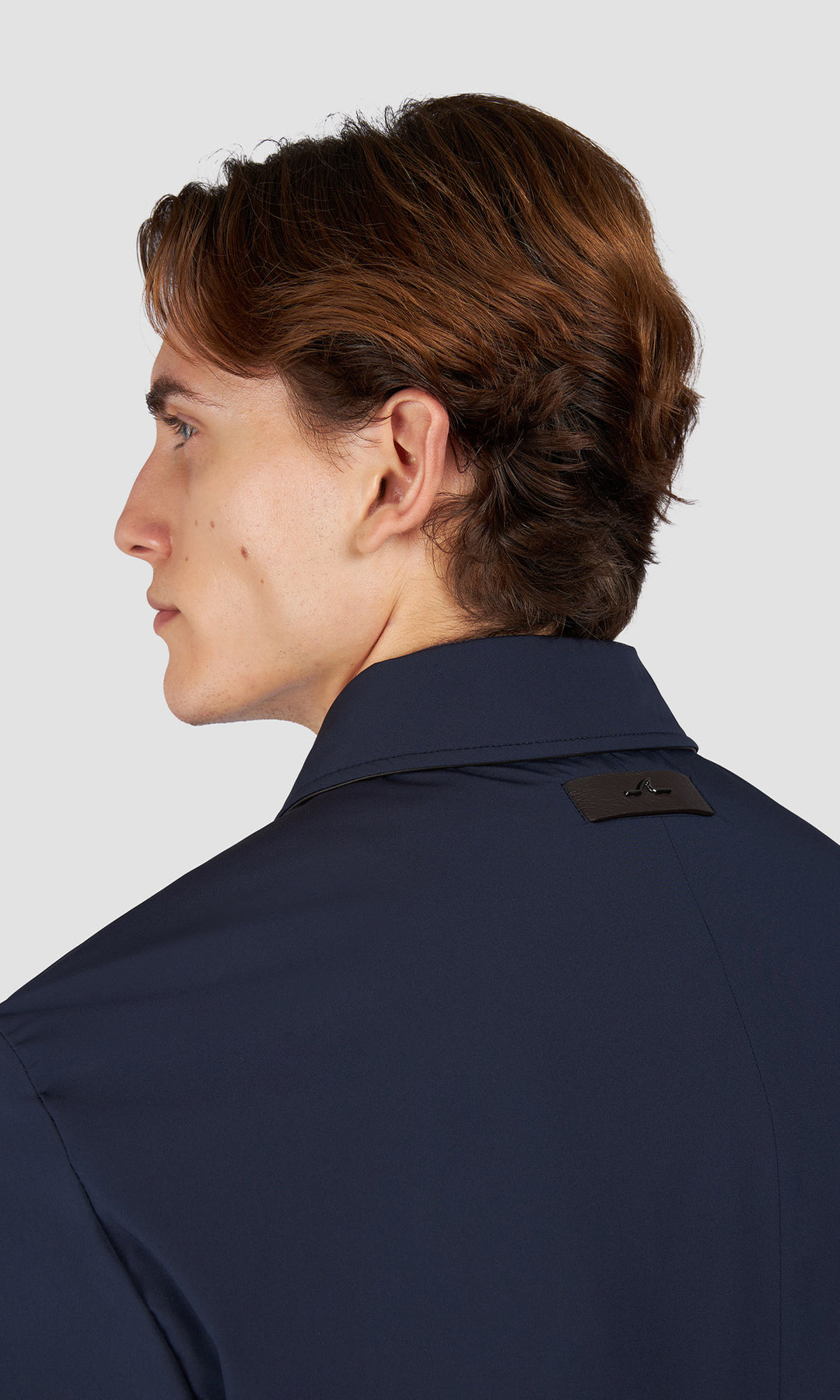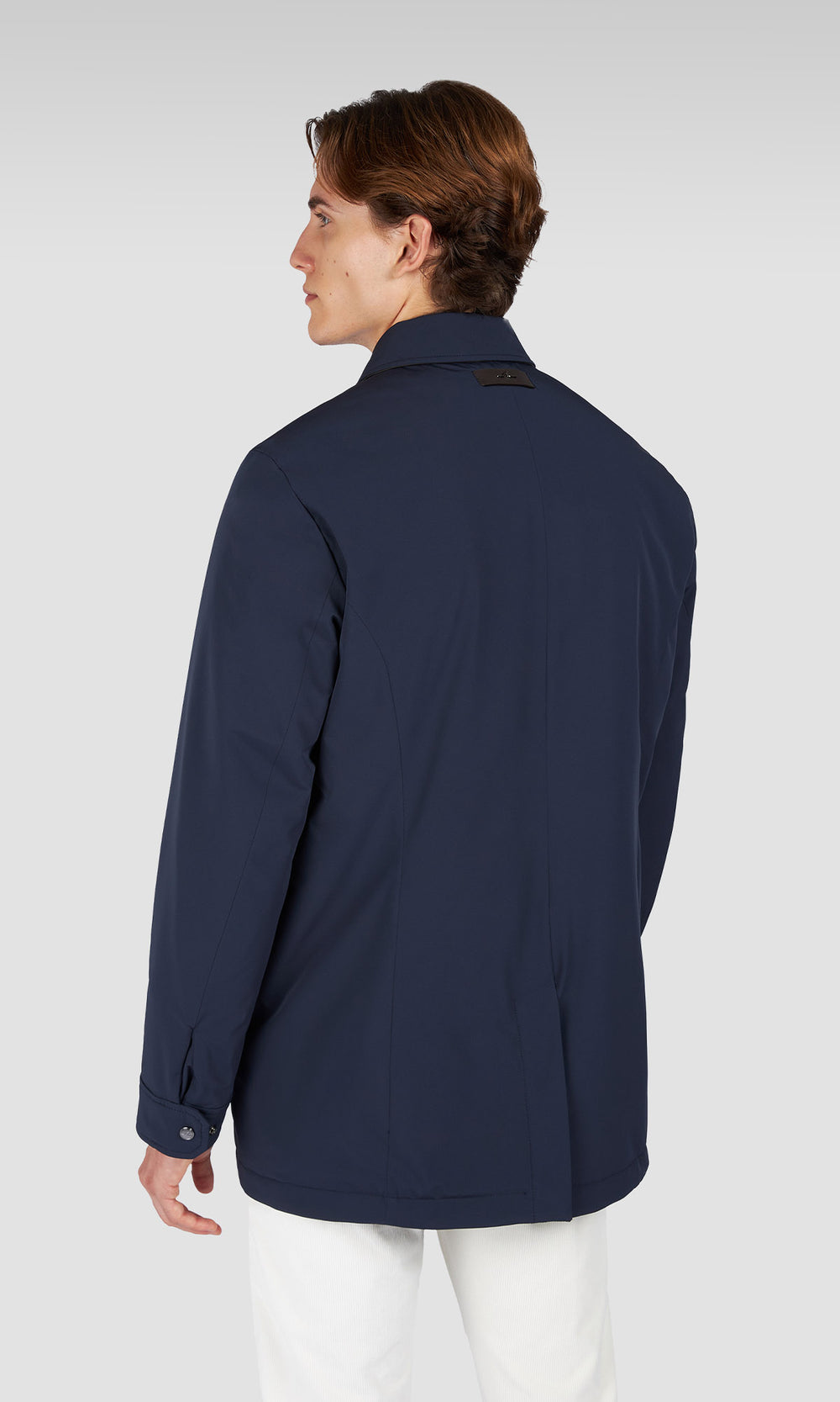 This dark blue jacket is crafted from water-repellent and windproof Typhoon Platinum fabric. It features a turn-down collar, a zip and snap placket, a leather logo patch on the back, and side welt pockets. This long jacket is perfect for cooler weather.