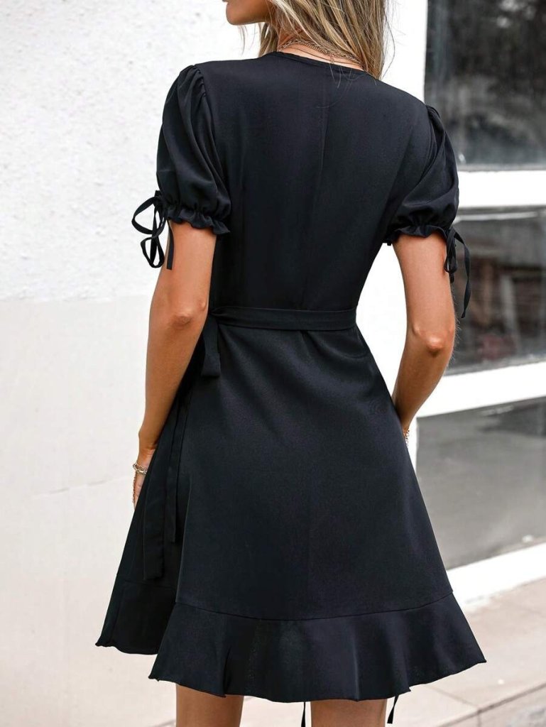 Never Needy Elegant Wrap Dress With Puff Short Sleeves