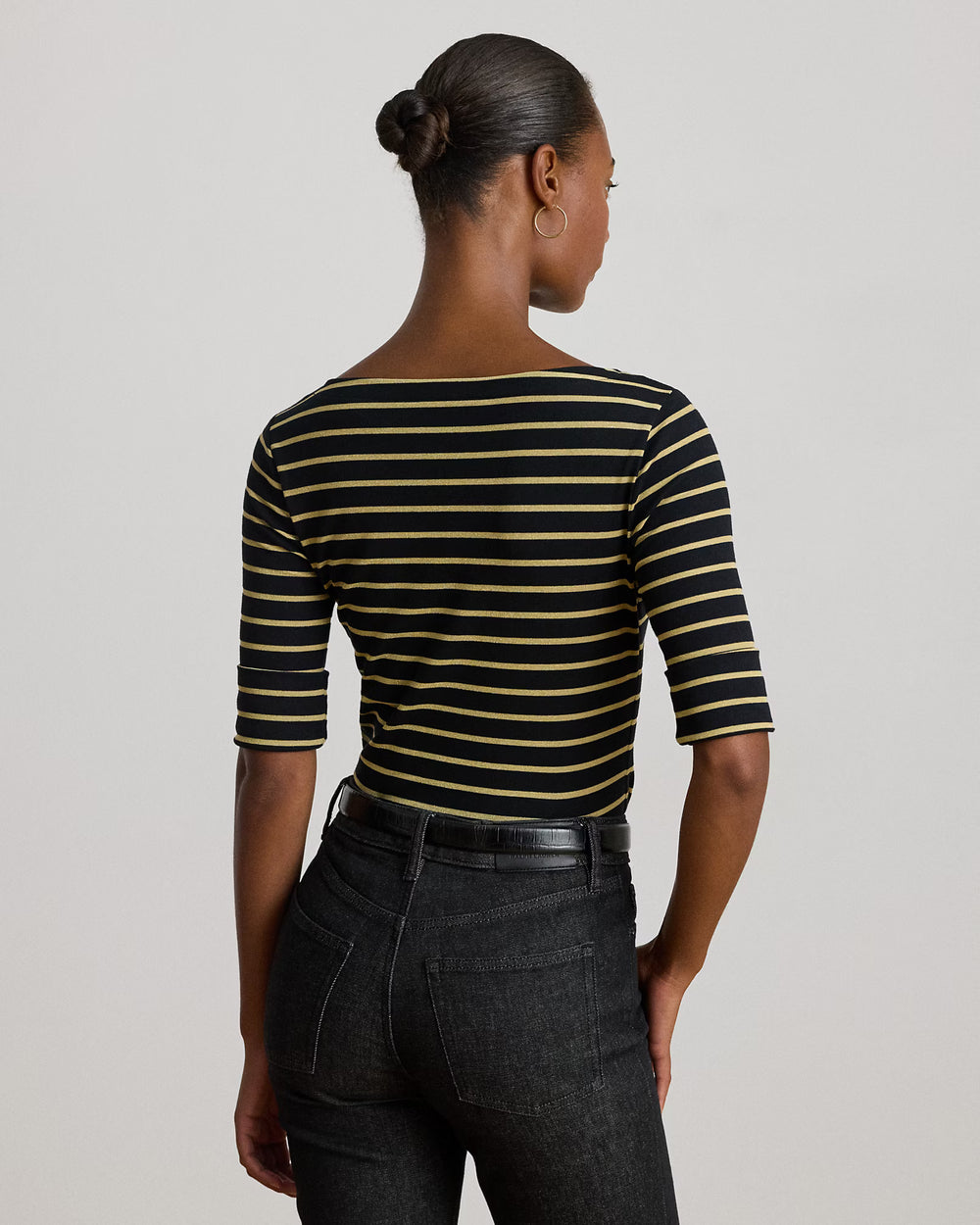 This stretch-cotton blend boatneck tee strikes a perfect balance between timeless style and modern appeal with its yarn-dyed metallic striped pattern.