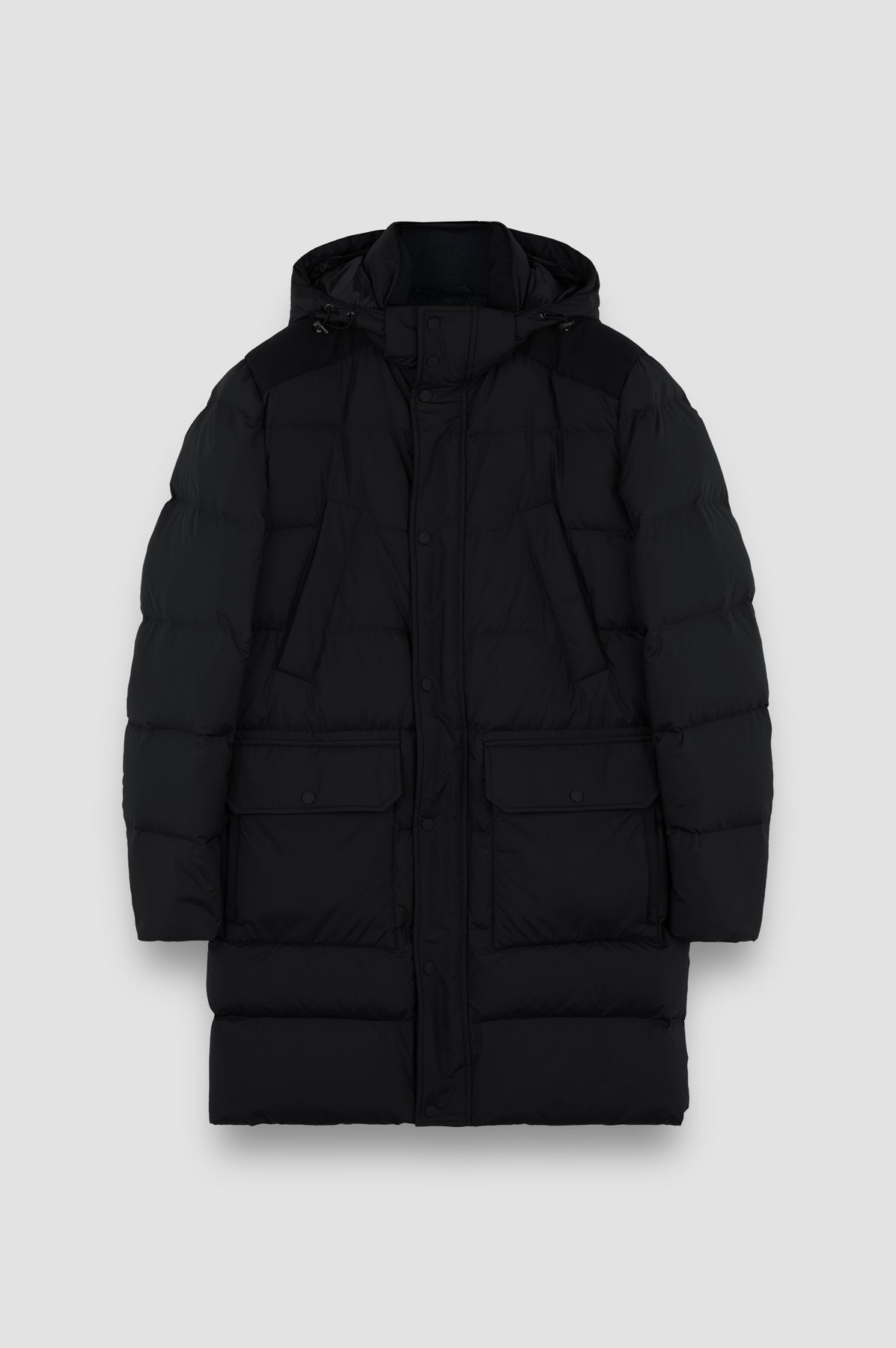 Black elongated quilted down jacket from PAUL&SHARK. - The fabric, created as part of the Save the Sea program, provides thermal insulation, waterproof and windproof properties, comfort and light weight, minimizing the negative impact on the environment. - A straight-cut model with long sleeves, welt and patch pockets, a high collar, a hood with a drawstring, a zip fastening and a windproof flap with buttons. - Thanks to the quilting, the filler is evenly distributed inside the product and retains heat better.