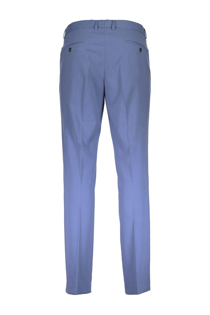 The trousers are classic suit trousers with pressed centre creases and jetted back pockets with buttons. The front closes with a button and hidden zipper.