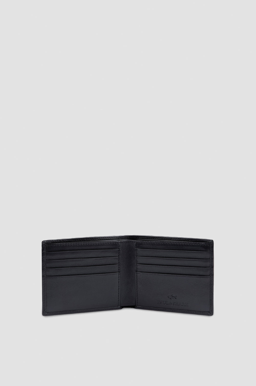 Black wallet made of soft fine-grain leather by PAUL&SHARK. - Swing bifold model with compartments for banknotes, slots for business cards and cards, embossed brand logo inside and on the front panel.