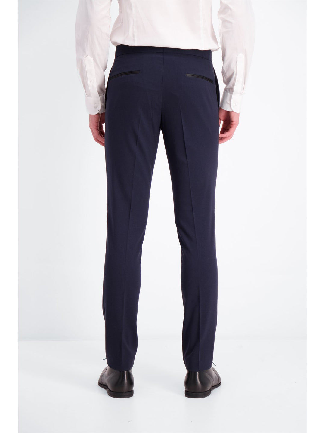 The trousers are in a simple design with pressed centre creases and jetted back pockets. Closes with hidden button and zipper.