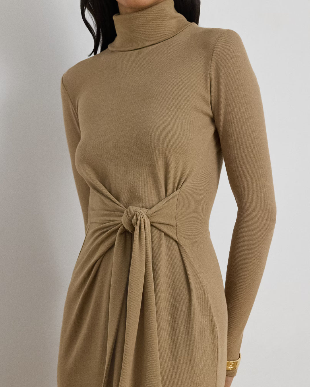 Rib-knit from a soft stretch-cotton blend, this roll neck dress is cut for a slim-fitting silhouette and a calf-grazing midi length. A tie-front design on the waist adds contemporary flare to this refined piece, while slits on the hem afford ease of movement.