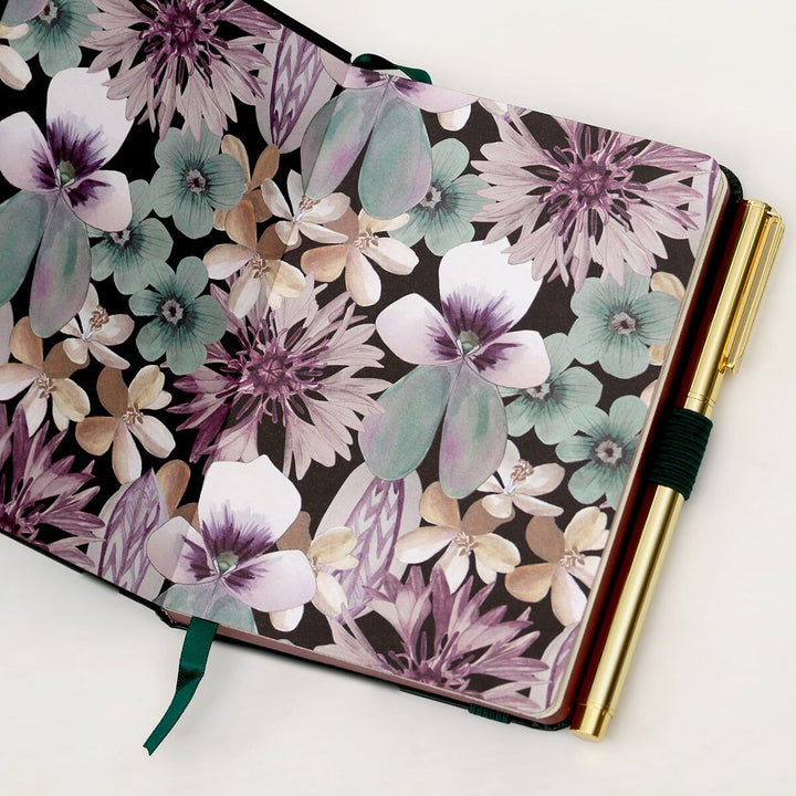 This mini A6 notebook has 192 lined pages inside, a ribbon page marker, an elastic closure and a gold pen that writes with black ink. With a dark green cover finished with a soft lilac Ted Baker logo across the bottom. Featuring an eye-catching print on the inside, of large flowers such as pansies, forget-me-not and cornflowers in soft pastel shades, all set against a crisp white background which allows the shapes and colours to really standout. Due to the petite size, this A6 notebook is portable and perfect for fitting in a bag or pocket for on-the-go notetaking.