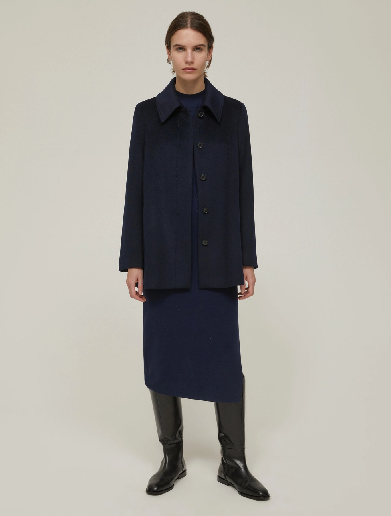 This elegant yet versatile pure wool broadcloth jacket can be worn straight or cinched via the matching belt; this can either be tied in classic fashion or threaded solely through the front.