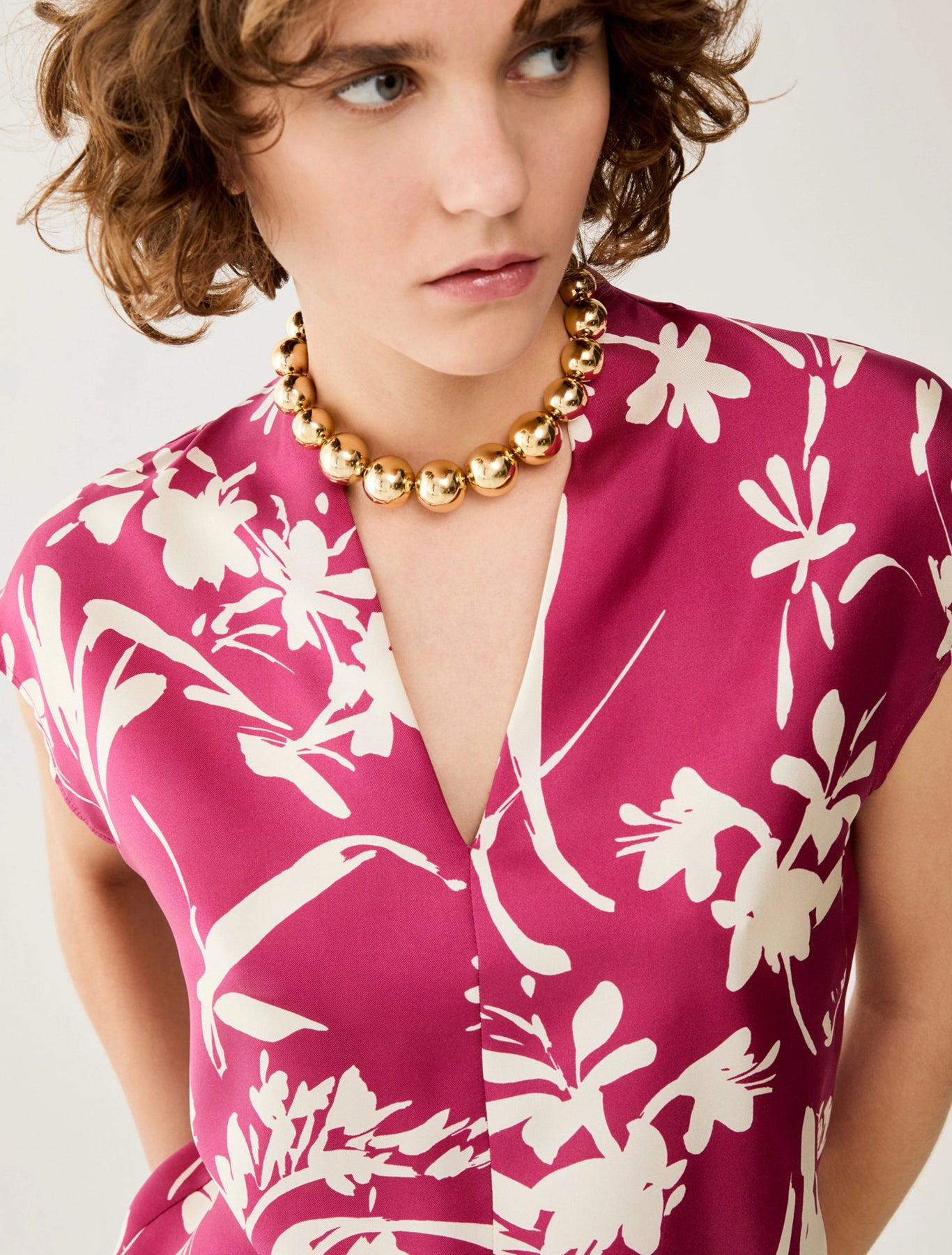 The fluid sheen of silk twill distinguishes this blouse, printed with graphic flowers on a solid colour: perfect for elegant outfits, but also for giving a chic twist to informal ones.