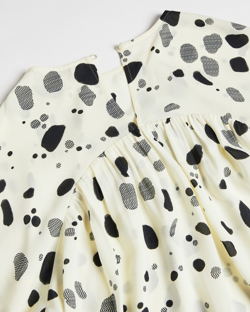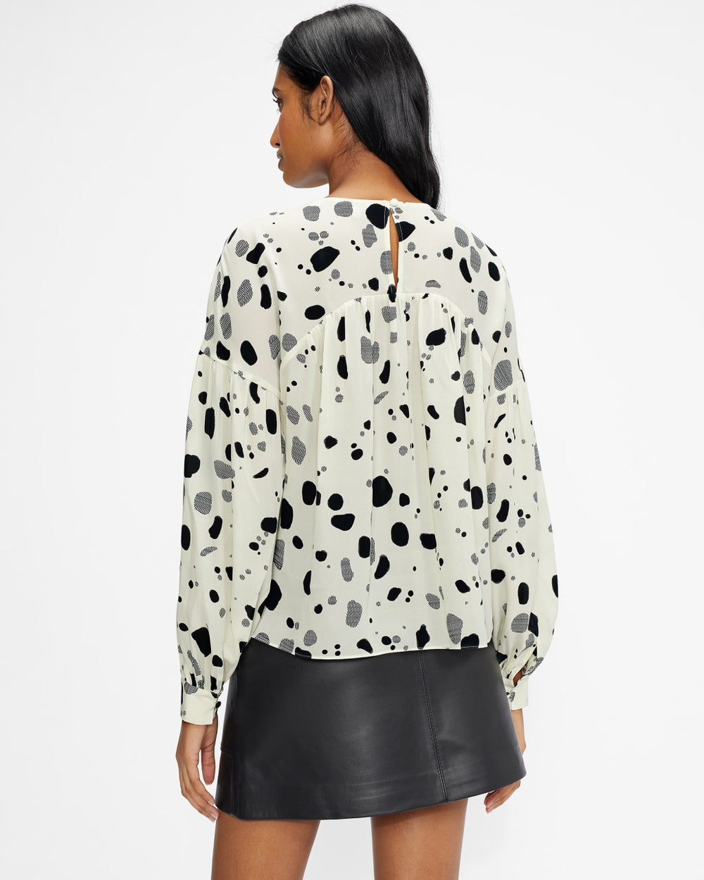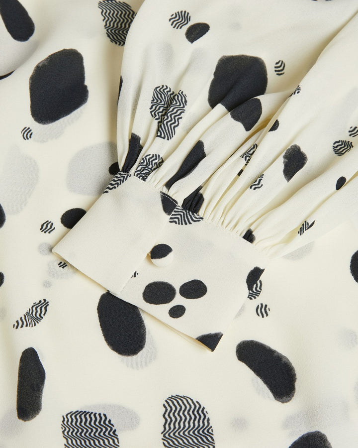 Get spotted for all the right reasons. The DANNICA collarless blouse has you covered – it’s softly flowing blouson fit looks great tucked into tailored trousers for work, or paired with a miniskirt for play. Classic but still fun, this will be a wardrobe favourite for seasons to come. This piece is made of certified recycled polyester. Using recycled polyester helps divert plastic from ending in landfills.